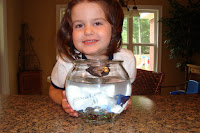I was trying to take the easy way of cleaning Bait’s bowl this morning. Instead of taking him out of the bowl, I left him in and would put the bowl under the kitchen sink faucet allowing water to fill up the bowl. I’d pour some water out making sure that Bait didn’t fall out of the bowl. I continued doing this over and over and noticed that the water was getting cleaner. All was going well with this process until Bait got a little too close to the edge of the bowl. It was like it all happened in slow motion. Bait poured out of the bowl with the rest of the water and filth and landed directly in the garbage disposal! I screamed out loud! The girls watched the whole thing happen and they were in a panic, too. My next thoughts were, “What do I do now? How do I get Bait out of there? If I cannot get him out or if he dies am I supposed to just grind him up in the garbage disposal?? I couldn’t bare the thought of having to do that! So, with a quick reaction, I grabbed some tongs out of my utensil drawer and began to try to “fish” Bait out of the garbage disposal. The poor guy kept flopping around and it was difficult to grab hold of him. Finally, I was able to get him out and plopped him into a glass of water I had poured for him to rest in until his bowl was clean. I breathed a sigh of relief, but noticed that Bait didn’t seem quite the same. At this point, I’m not sure that anything happened to Bait. I didn’t see him bleeding (I don’t know what fish blood looks like!), but he seems traumatized for sure! I wonder why?? I’m not sure if he’ll make it or not, but at least he now has a nice clean bowl to either live or die in.