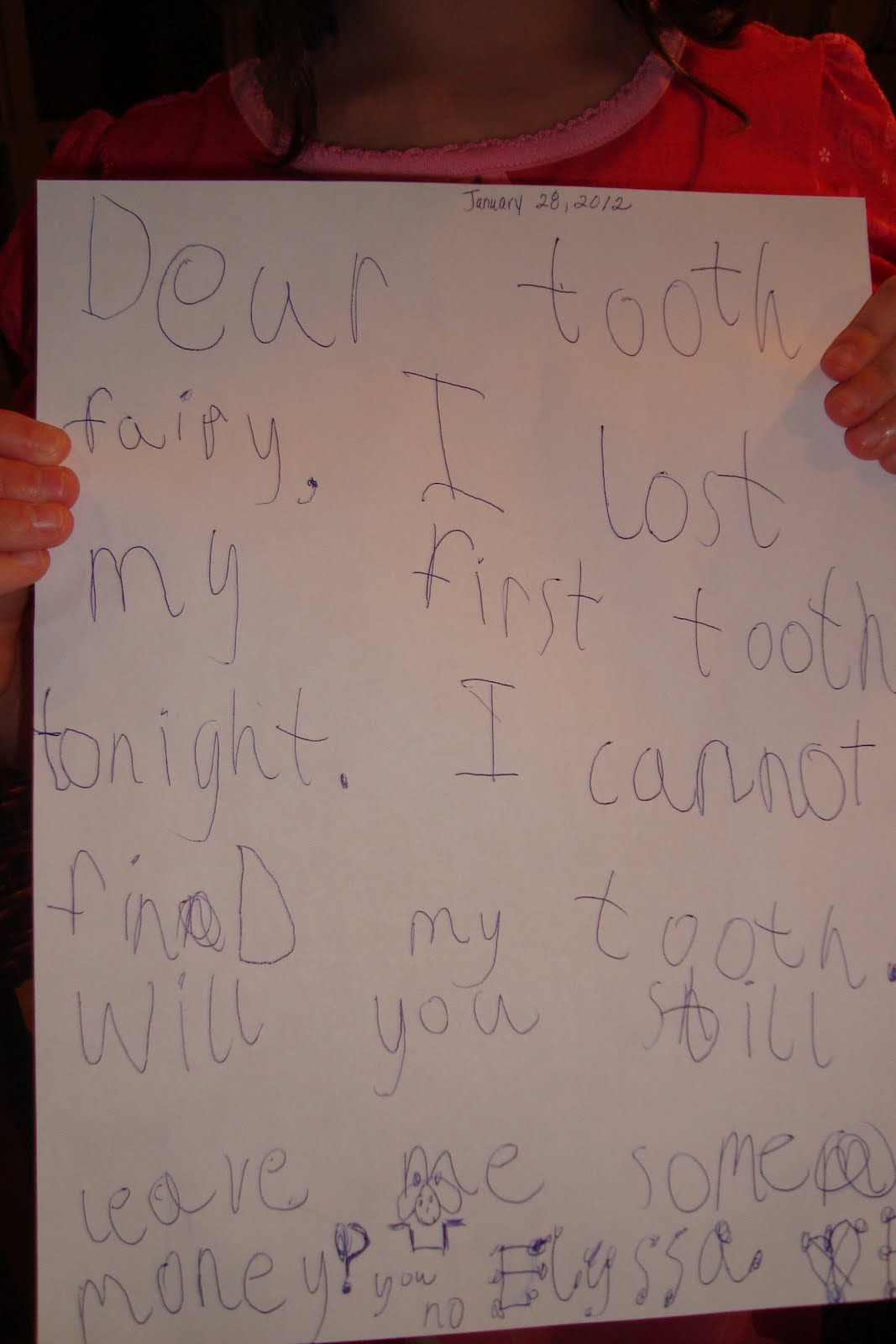 I had Elyssa write the Tooth Fairy a letter. She told the Tooth Fairy that she had lost her first tooth, but she was still asking for money!